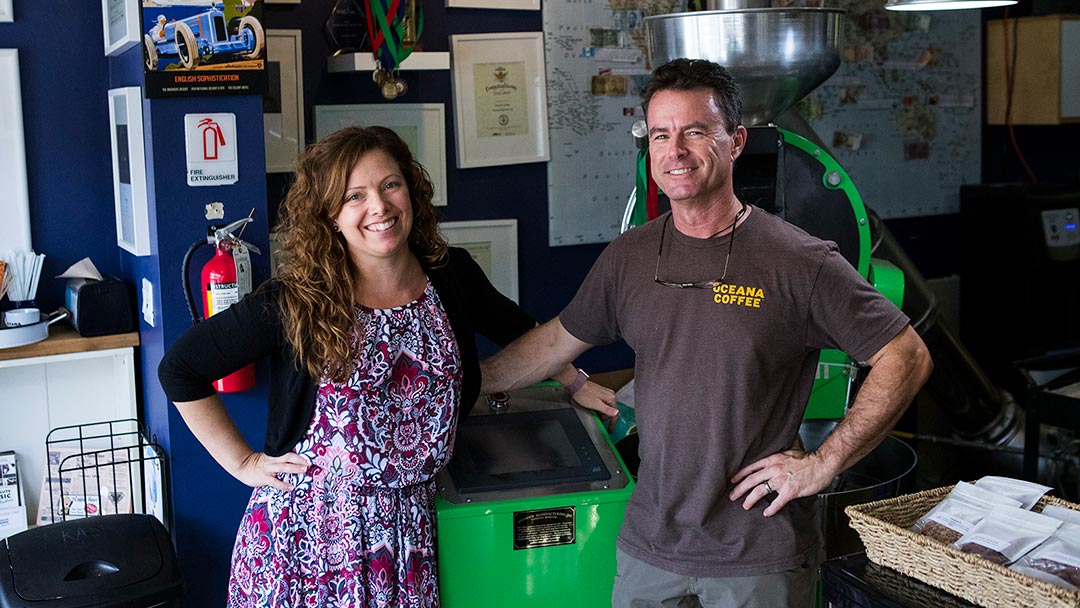 He bought a $35 popcorn maker from eBay and converted it into a coffee roaster machine. The resulting fresh roasted coffee was a resounding success, not just with Scotty but with his wife Amy and their friends and family as well! Scotty realized he was onto something and began experimenting with his coffee roaster, roasting bigger and better batches of whole bean coffee. And so Oceana Coffee Roasters company was born.